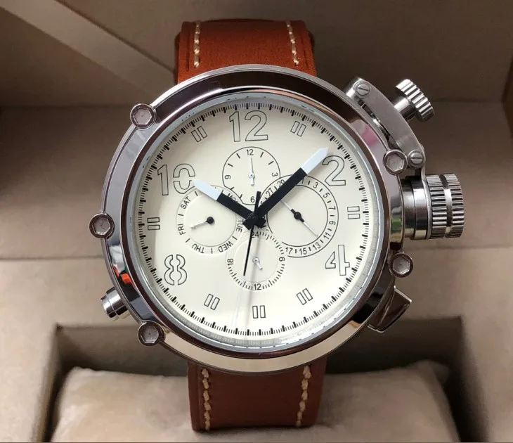 Best Seller 50mm GEERVO right hand crown White dial Automatic Self-Wind movement Auto Date Men's watch cow Leat